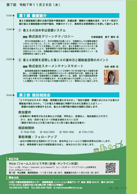 広島県では2050年ネット・ゼロカーボンに向け、県内企業における省エネの取り組みを後押しするための省エネ補助金活用セミナー・相談会を開催しています。セミナーでは専門家をお招きし、補助制度の特徴と活用ポイントについての説明や個別相談会も開催しますので、ぜひこの機会に省エネ設備の導入や建築物の省エネ化を検討してみませんか?